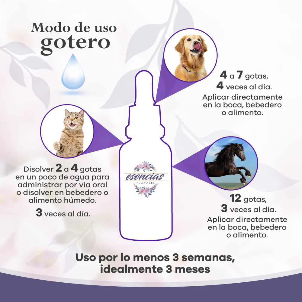 Las esencias florales son preparados vibracionales que sirven para modular los estados emocionales y armonizar el campo energético del animal.